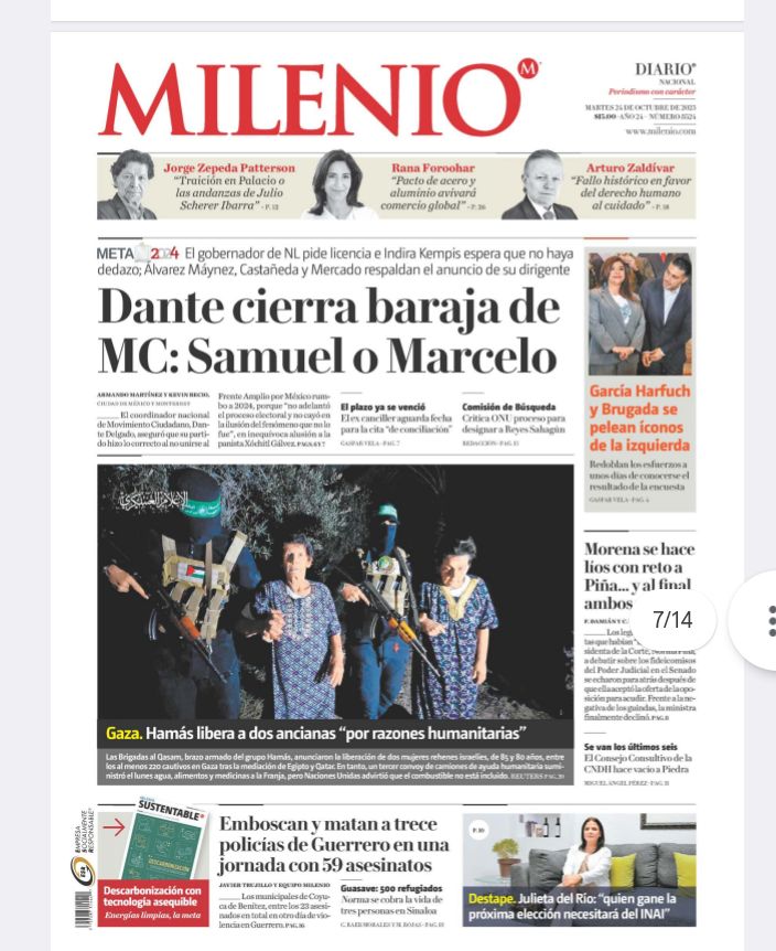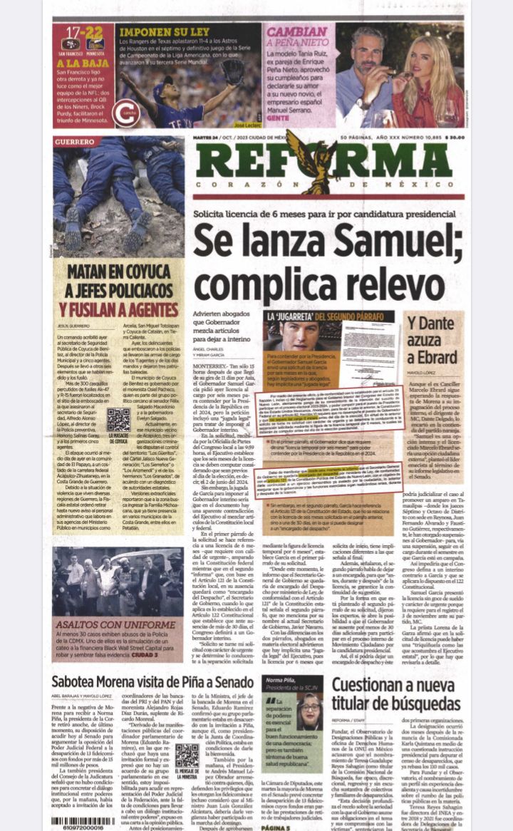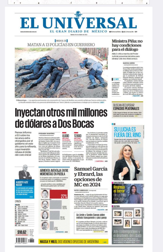 InicioEstadoLocales LocalesPortada Las de ocho columnas nacionales: Samuel y Marcelo, opciones de MC Por Redacción RIO 24 octubre, 2023 07:08 0 524 FacebookXPinterestWhatsApp Estas son las noticias de los principales periódicos nacionales el día de hoy 24 de octubre: Cuota FacebookXPinterestWhatsApp Artículo anteriorEfeméridesRIO: Día de las Naciones UnidasArtículo siguienteDejará tormenta tropical Otis lluvias de variables intensidad en el estado Redacción RIO Articulos relacionados Sin categoría Detiene Gabinete de Seguridad a cuatro presuntos responsables de realizar disparos en la calle de Galeana Locales Trabaja Gobierno de Oaxaca en drenaje sanitario de San Martín Mexicapam* Sin categoría México rechaza informe del Comité de Desapariciones Forzadas de la ONU por omitir avances contra desapariciones forzadas desde 2018 DEJA UNA RESPUESTA Cancelar respuesta Comentario: Por favor ingrese su comentario! Nombre:* Por favor ingrese su nombre aquí Correo electrónico:* ¡Has introducido una dirección de correo electrónico incorrecta! Por favor ingrese su dirección de correo electrónico aquí Sitio web: Guardar mi nombre, correo electrónico y sitio web en este navegador la próxima vez que comente. Siguenos...46,000FansMe gusta8,888SeguidoresSeguir56,777SuscriptoresSuscribirte _ Anuncio _ Ultimos articulos Sin categoría Detiene Gabinete de Seguridad a cuatro presuntos responsables de realizar disparos en la calle de Galeana Locales Trabaja Gobierno de Oaxaca en drenaje sanitario de San Martín Mexicapam* Sin categoría México rechaza informe del Comité de Desapariciones Forzadas de la ONU por omitir avances contra desapariciones forzadas desde 2018 Nacional ONU ve indicios de crímenes de lesa humanidad por desapariciones en México Sin categoría Exigía 9 mil 500 pesos diarios: cae presunto extorsionador en Huajuapan Cargar más