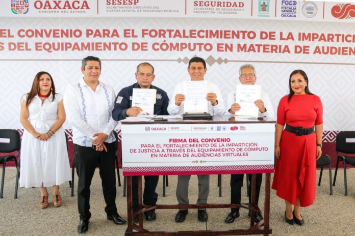 El Gobernador Salomón Jara Cruz y el presidente del Tribunal Superior de Justicia de Oaxaca (TSJO) Eduardo Pinacho Sánchez firmaron un convenio para el Fortalecimiento de la Impartición de Justicia a través del Equipamiento de Cómputo en Materia de Audiencias Virtuales con el objetivo de realizar audiencias y actuaciones judiciales a distancia desde el interior de los Centros Penitenciarios de la entidad.