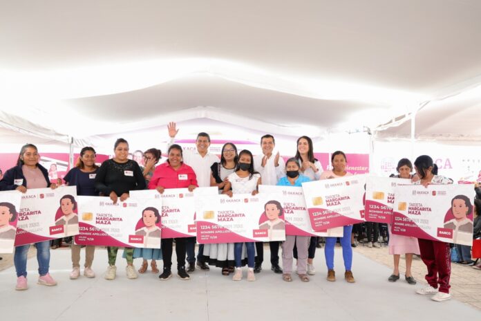 El Gobernador Salomón Jara Cruz inició la entrega de las tarjetas Margarita Maza, con las que se distribuye un apoyo de aproximadamente dos mil pesos mensuales para 14 mil 805 jefas de familia de las ocho regiones del estado.