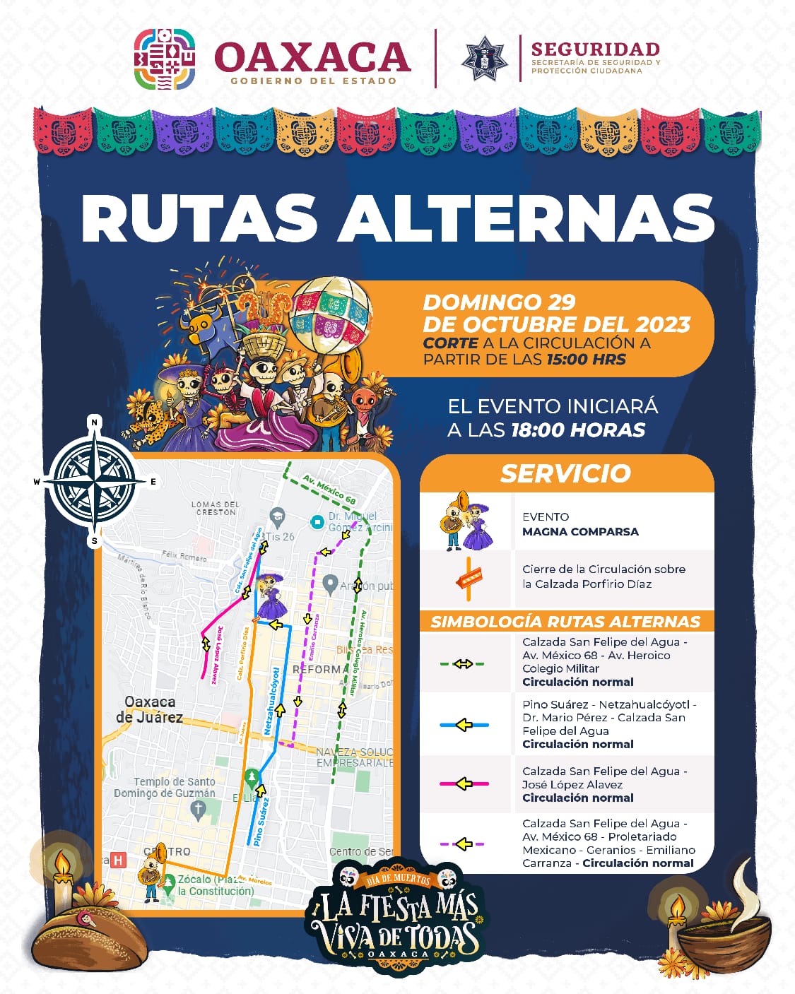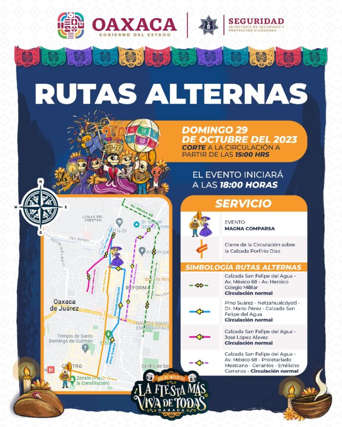 Con motivo de la Magna Comparsa que se llevará a cabo este domingo a partir de las 18: 00 horas, desde la Fuente de las Ocho Regiones a la Alameda de León de la ciudad de Oaxaca, el Gobierno del Estado a través de la Secretaría de Seguridad y Protección Ciudadana informa sobre las rutas y vías alternas que se habilitarán.
