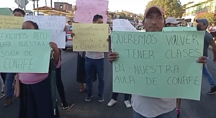 La mañana de este jueves, un grupo de padres de familia del Instituto Estatal de Educación para Adultos (CONAFE), instalaron un bloqueo en el Puente de Fierro en Santo Domingo Tehuantepec.