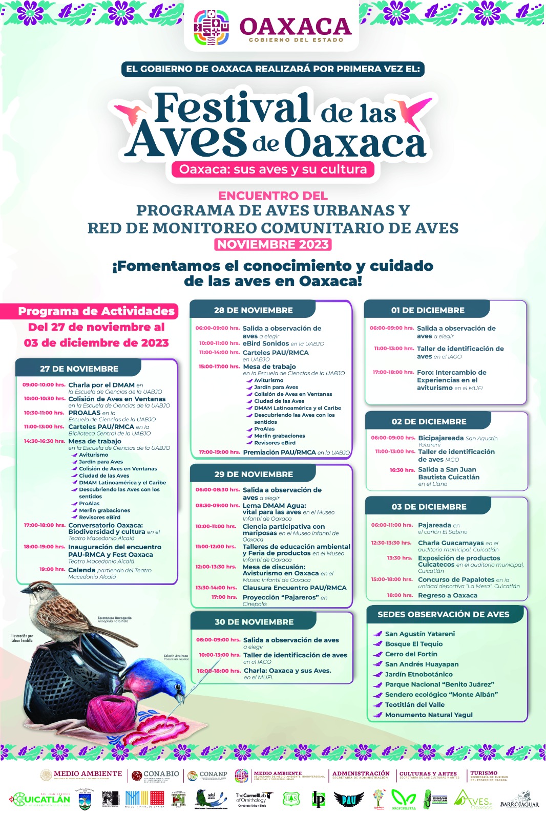 Con un versátil programa que contempla conversatorios sobre biodiversidad y cultura, mesas de discusión sobre aviturismo, foros de intercambio de experiencias, actividades culturales y de educación ambiental como salidas de observación de aves en Áreas Naturales Protegidas, este primer Festival tendrá como sedes la Ciudad de Oaxaca y el municipio de San Juan Bautista Cuicatlán.