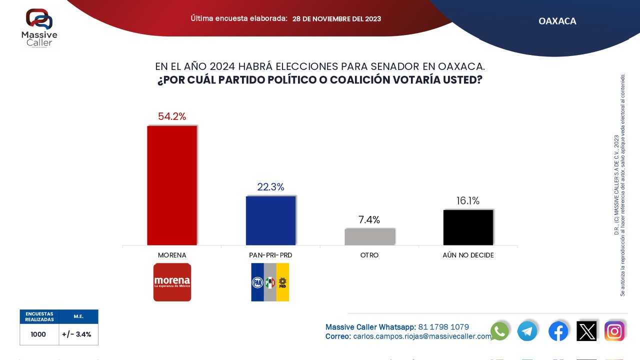La encuesta telefónica de MassiveCaller (@MassiveCaller) revela una ventaja de casi 32 puntos porcentuales de Morena sobre cualquier otro candidato, en caso de que vayan en coalición, aunque para Oaxaca no habrá candidatos del FAM al Senado, serán candidaturas individuales.