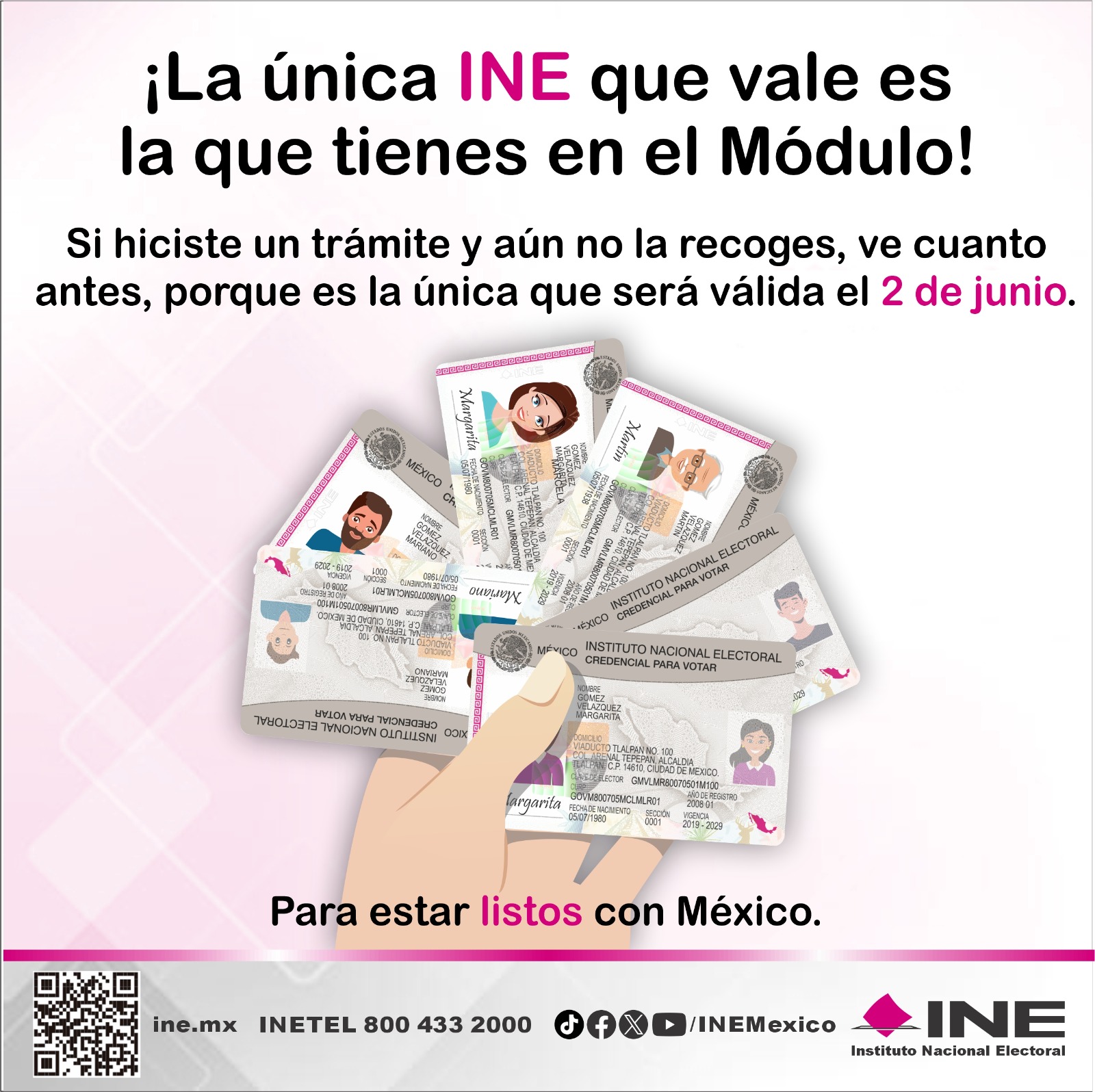 Del mismo modo se le reitera a la ciudadanía que únicamente con credenciales vigentes se podrá votar el próximo 2 de junio. En la actualidad hay cuatro modelos de credenciales vigentes y válidos para ejercer el derecho al voto.