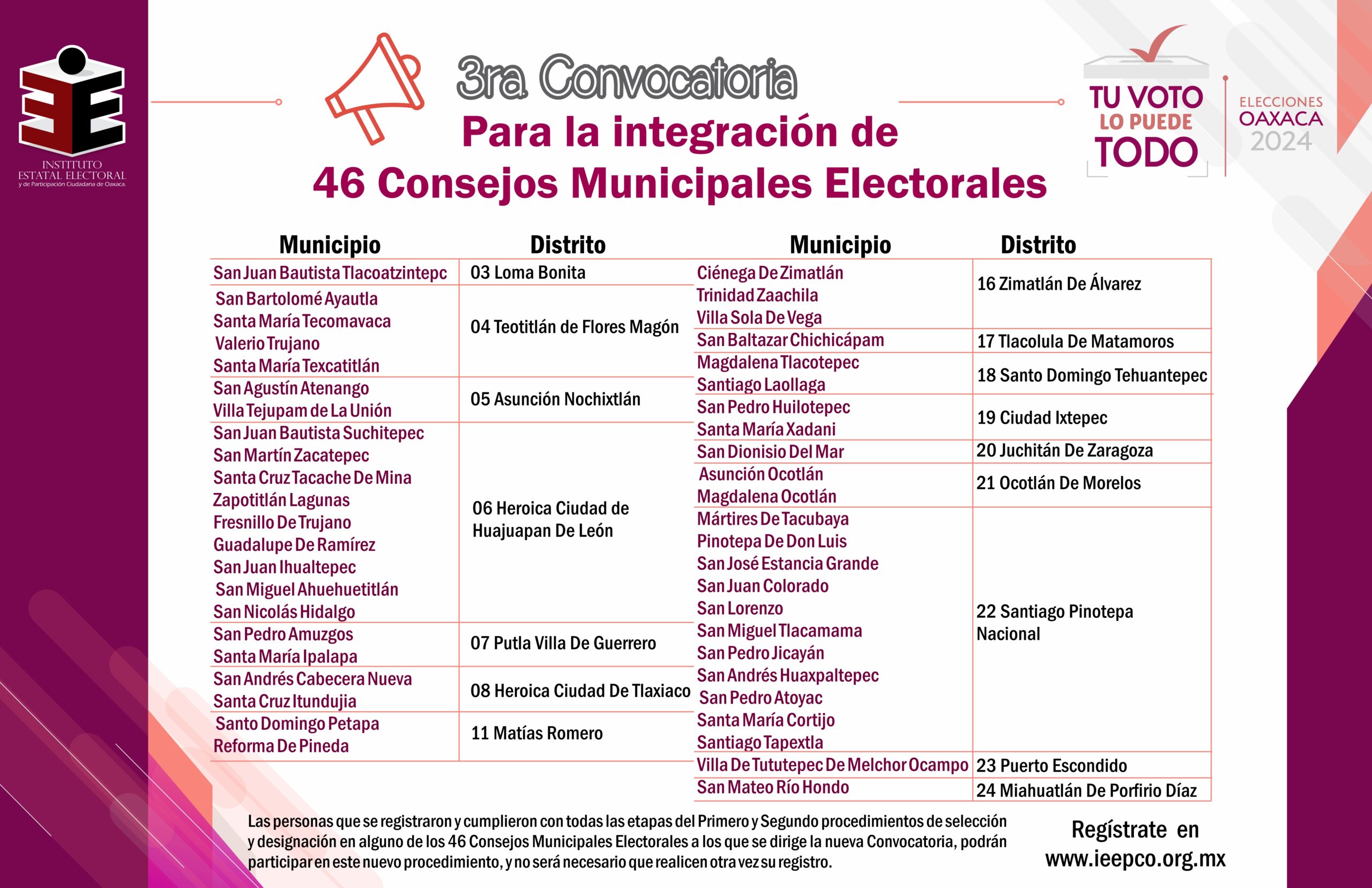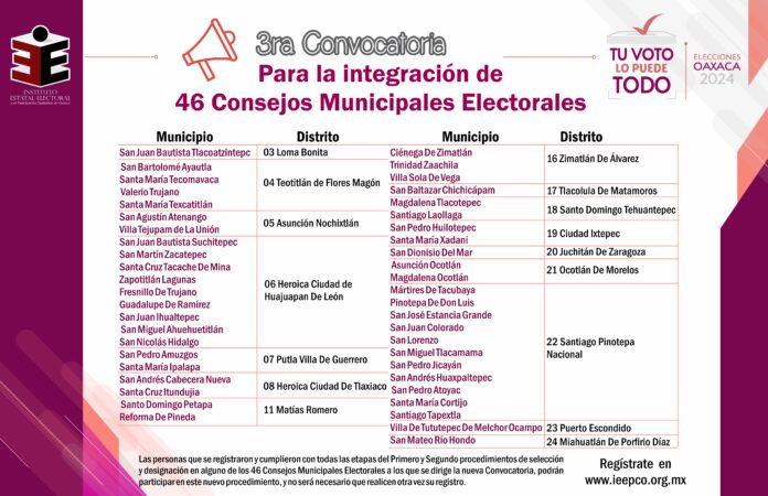 El Consejo General del Instituto Estatal Electoral y de Participación Ciudadana de Oaxaca (IEEPCO) aprobó la tercera convocatoria para integrar 46 Consejos Municipales Electorales para el Proceso Electoral Local Ordinario 2023-2024, en atención a lo ordenado por el Tribunal Electoral del Estado de Oaxaca en las sentencias RA/06/2024 y RA/07/2024.