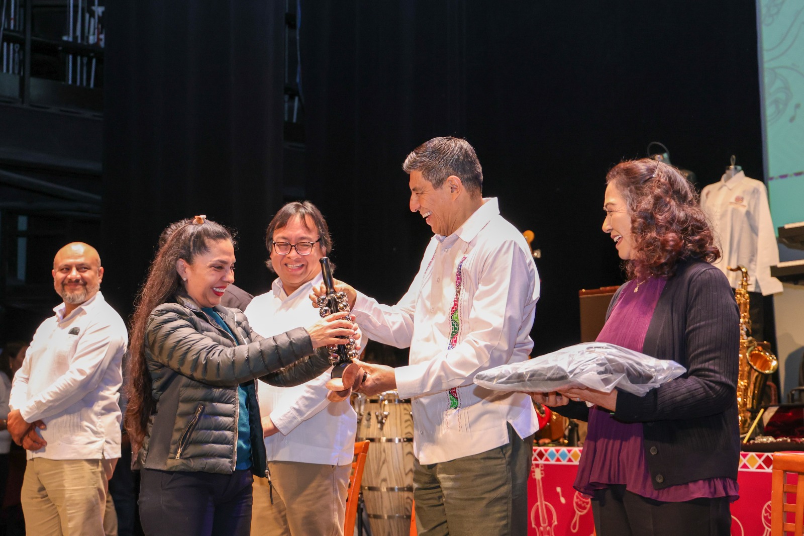 De manera simbólica se entregaron 77 instrumentos musicales de alta gama, con un valor de 4 millones 972 mil 215 pesos, así como 505 piezas de uniformes, con inversión de 568 mil 992 pesos, que fueron adquiridos en 2023 y entregados por temas de agenda en este año.