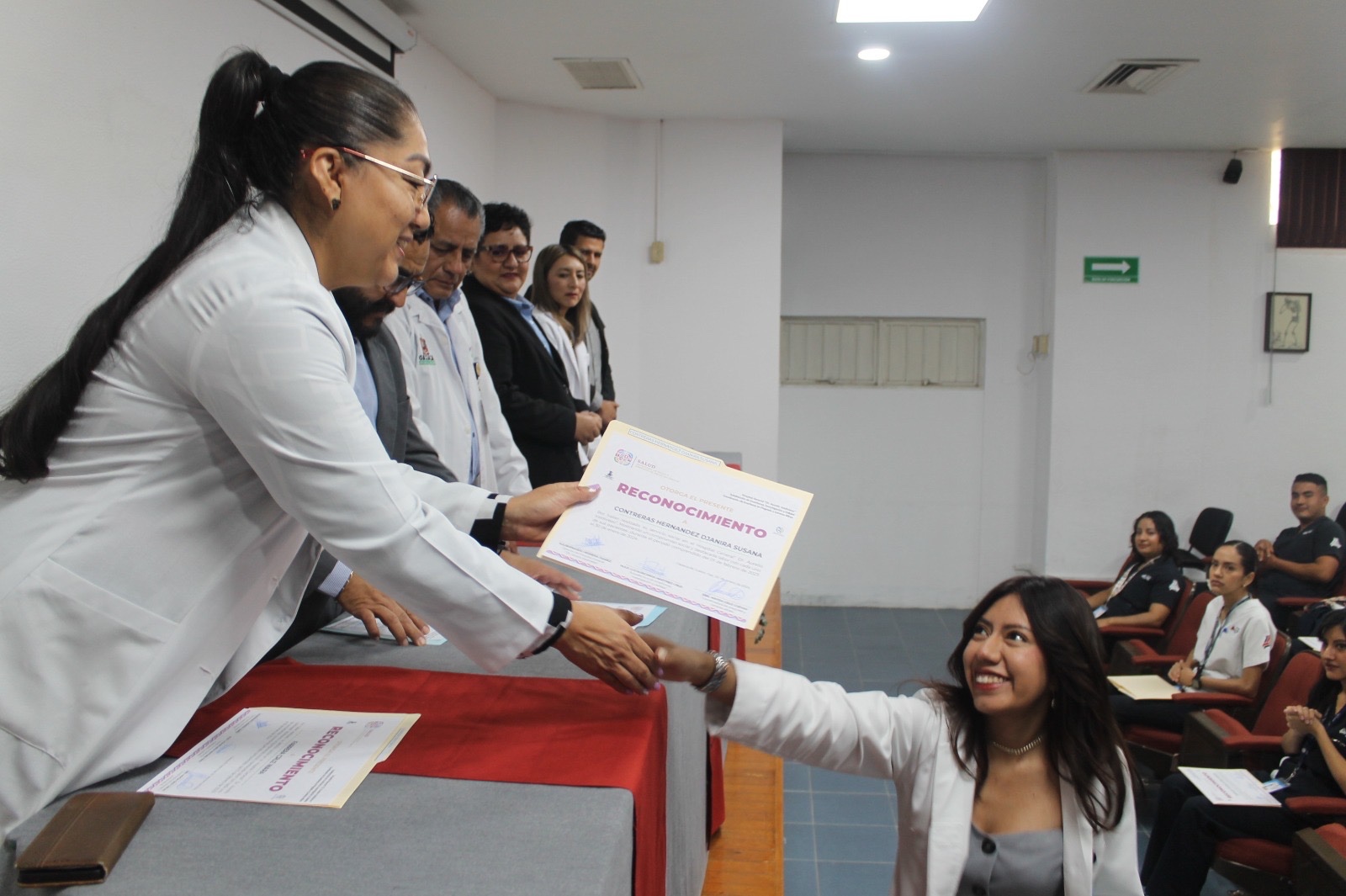 En la ceremonia de graduación, las autoridades hospitalarias entregaron reconocimientos a estudiantes egresados, por concluir satisfactoriamente este proceso en su formación profesional e hicieron una distinción especial por su excelente desempeño académico durante su servicio social a: Javier Iván Sierra Contreras, pasante de la licenciatura en Fisioterapia de la Universidad La Salle Oaxaca, e Inara Farrera Cruz, pasante de la licenciatura en Psicología de la Universidad del Golfo de México.