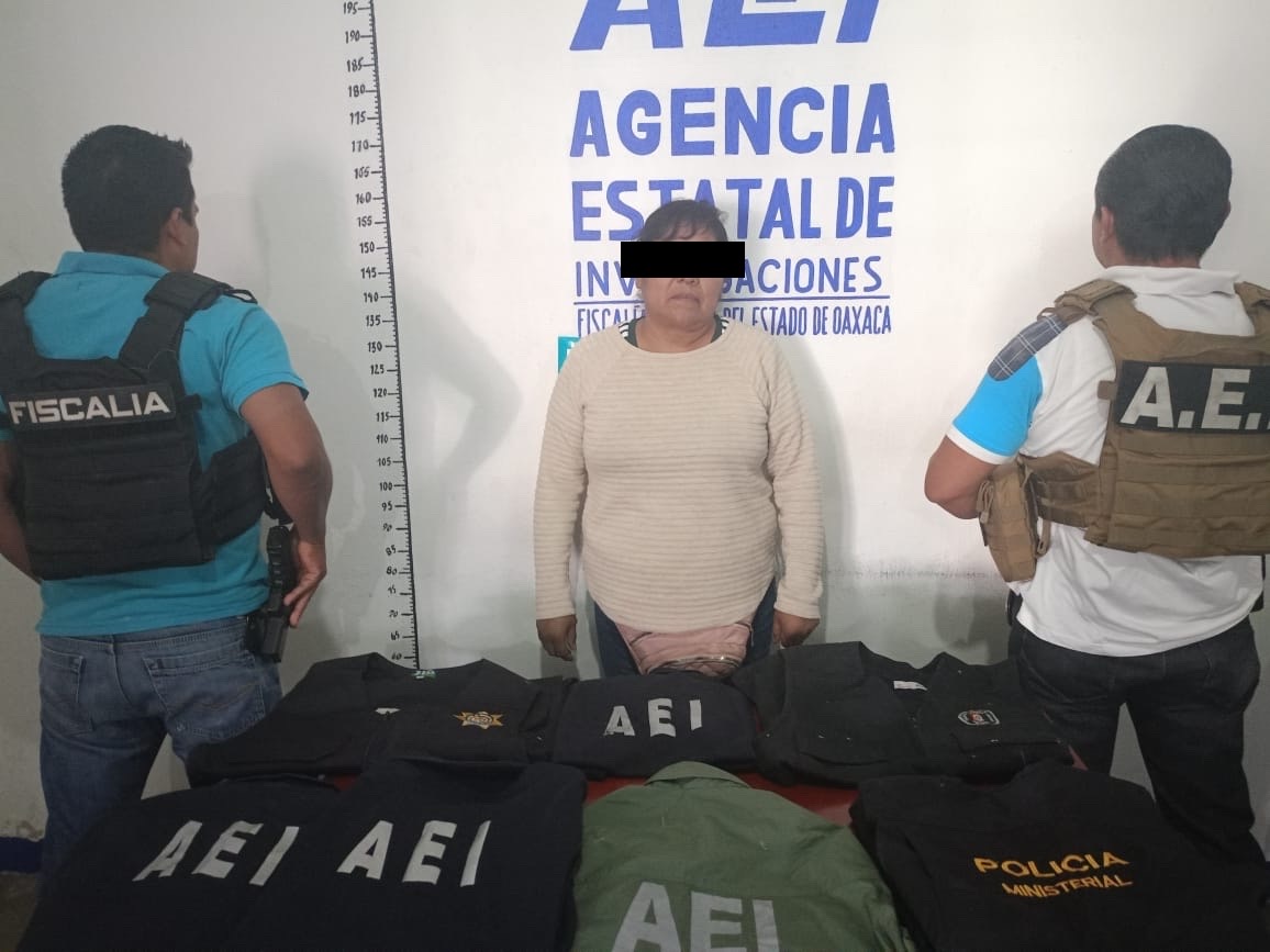 Oaxaca de Juárez, Oax., a 23 de febrero de 2024.- La Fiscalía General del Estado de Oaxaca (FGEO), a través de la Agencia Estatal de Investigaciones (AEI), realizó la detención de una mujer identificada por las iniciales L. S. C., por el delito contra actos de investigación, actividades de seguridad pública y del Estado, luego de ser sorprendida tratando de vender uniformes oficiales de la AEI.