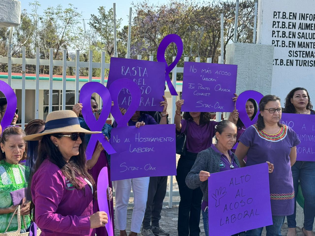 Previó a celebrarse el Día Internacional de la Mujer, integrantes del Sindicato Único de Trabajadores Docentes del Colegio Nacional de Educación Profesional Técnica del Estado de Oaxaca (SUTDCEO) protestaron al exterior del Conalep Plantel 039 ubicado en San Antonio de la Cal.