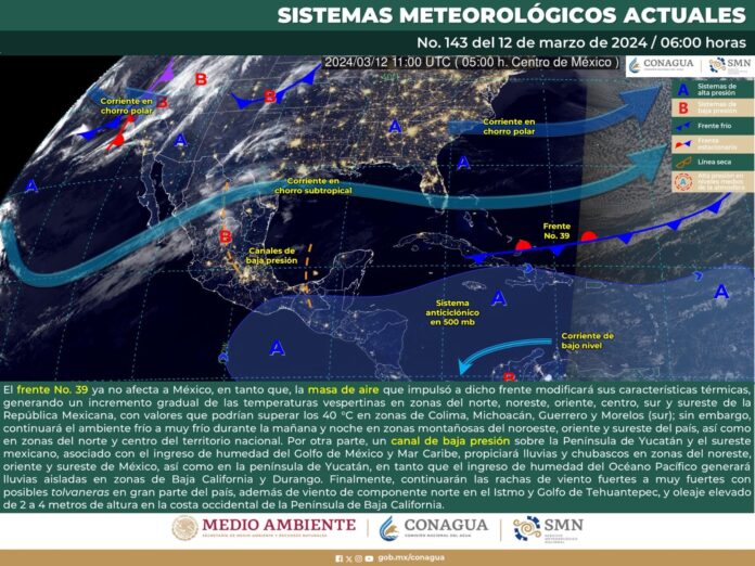 La Coordinación Estatal de Protección Civil y Gestión de Riesgos (CEPCyGR) informa que la masa de aire frío que impulsa al frente frío número 39, comenzará a modificar sus características térmicas, lo que ocasionará un ambiente caluroso en la entidad.