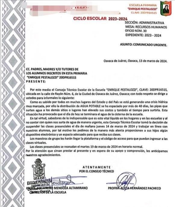El consejo técnico escolar de la institución determinó que al no contar con quien surtiera de manera urgente del vital líquido al plantel era necesaria la suspensión de clases presenciales para trabajar en línea con el alumnado.
