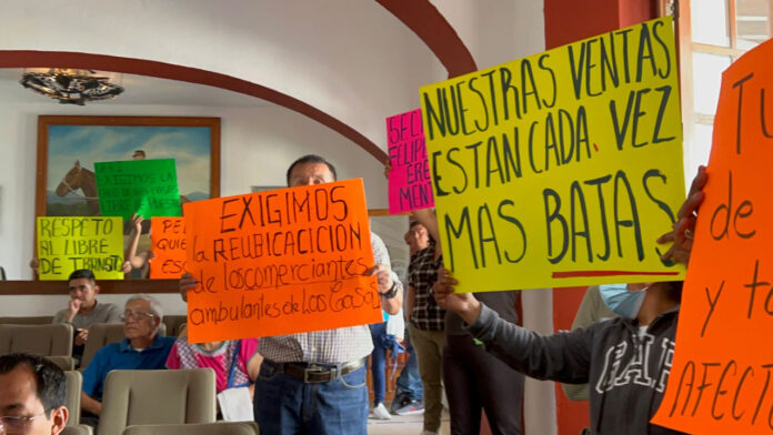 Comerciantes formales de la calle de Las Casas, en el municipio de Oaxaca, protestaron este jueves en la sesión de cabildo por la presencia de puestos ambulantes en ese cuadro de la ciudad capital.