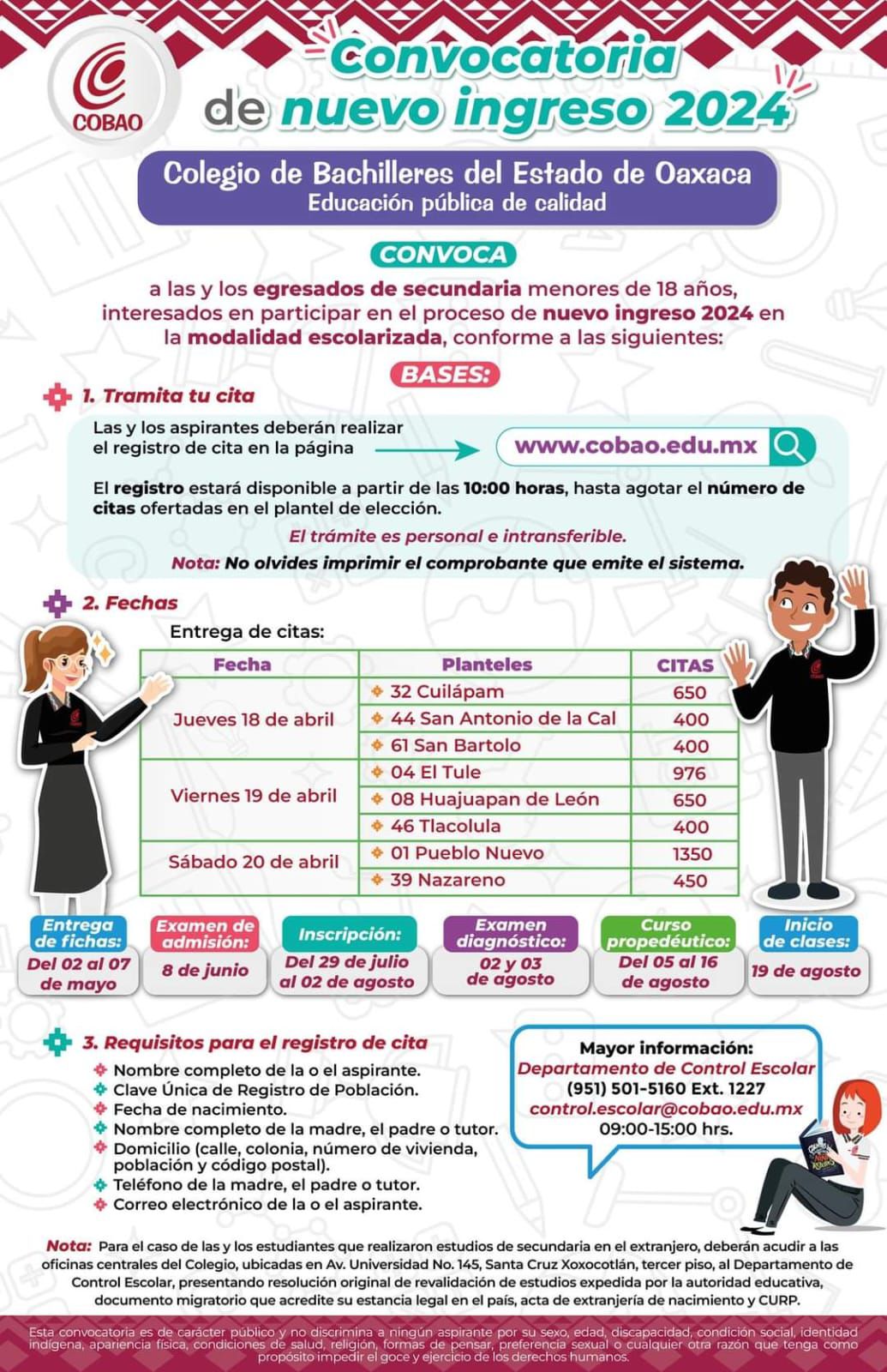 El Colegio de Bachilleres del Estado de Oaxaca (Cobao) informa que ya está abierta la convocatoria de nuevo ingreso 2024, en ocho planteles de la entidad.