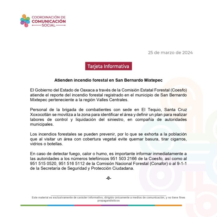 El Gobierno del Estado de Oaxaca a través de la Comisión Estatal Forestal (@COESFO_GobOax ) atiende el reporte del incendio forestal registrado en el municipio de San Bernardo Mixtepec perteneciente a la región Valles Centrales.
