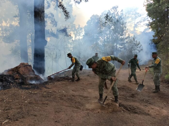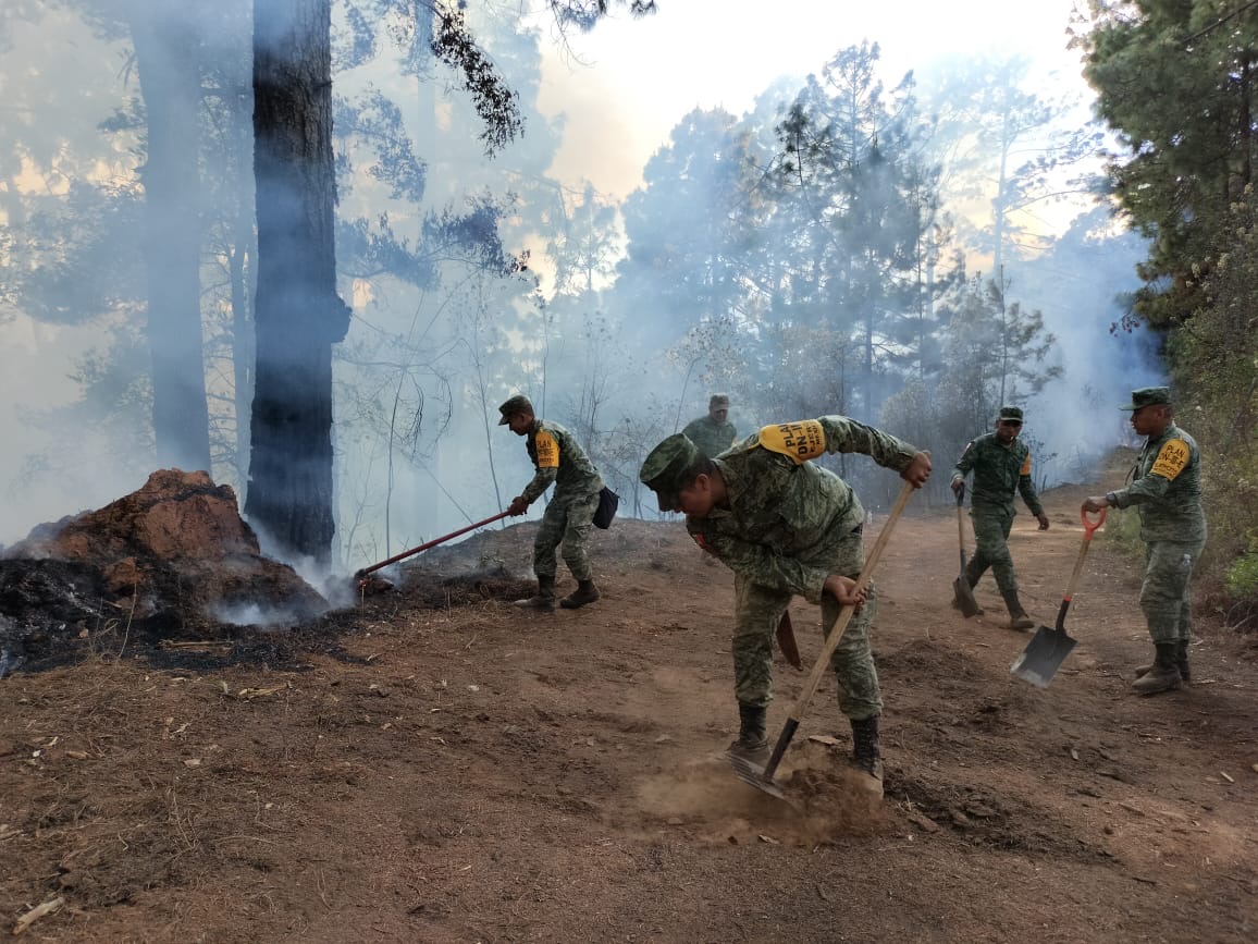En este sentido, los trabajos de combate, control y liquidación del incendio forestal son reforzados por personal de la Secretaría de la Defensa Nacional (Sedena) y Guardia Nacional (GN).