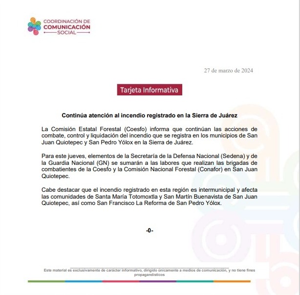 Cabe destacar que el incendio registrado en esta región es intermunicipal y afecta las comunidades de Santa María Totomoxtla y San Martín Buenavista de San Juan Quiotepec, así como San Francisco La Reforma de San Pedro Yólox.
