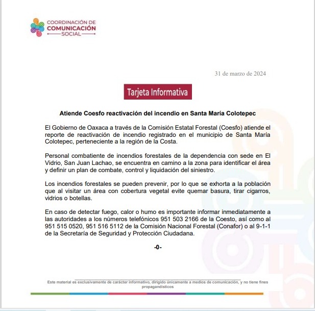El Gobierno de Oaxaca a través de la Comisión Estatal Forestal (Coesfo) atiende el reporte de reactivación de incendio registrado en el municipio de Santa María Colotepec, perteneciente a la región de la Costa.