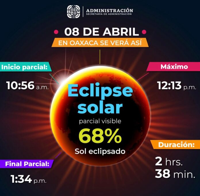 De acuerdo con expertos de la Universidad Nacional Autónoma de México (UNAM), el eclipse tendrá una visibilidad del 68 por ciento en el estado de Oaxaca, alcanzando su punto máximo a las 12:13 horas.