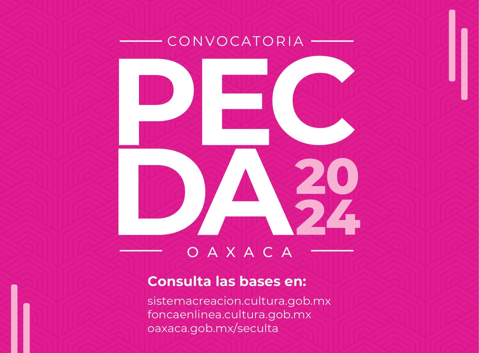 La convocatoria puede ser consultada en https://foncaenlinea.cultura.gob.mx/archivosbases/bases_POAX_2024_5447.pdf y estará abierta a partir del 24 de abril y hasta el 24 de mayo del presente año a las 15:00 horas. Los proyectos deben registrarse en foncaenlinea.cultura.gob.mx.