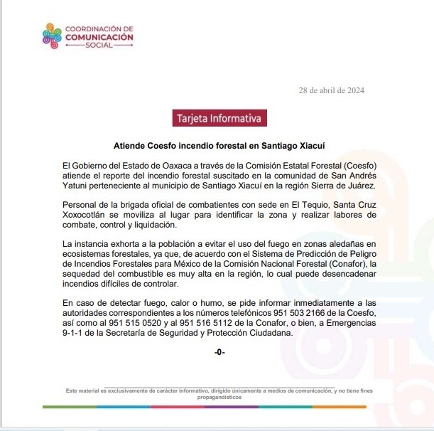 El Gobierno del Estado de Oaxaca a través de la Comisión Estatal Forestal (Coesfo) atiende el reporte del incendio forestal suscitado en la comunidad de San Andrés Yatuni perteneciente al municipio de Santiago Xiacuí en la región Sierra de Juárez.