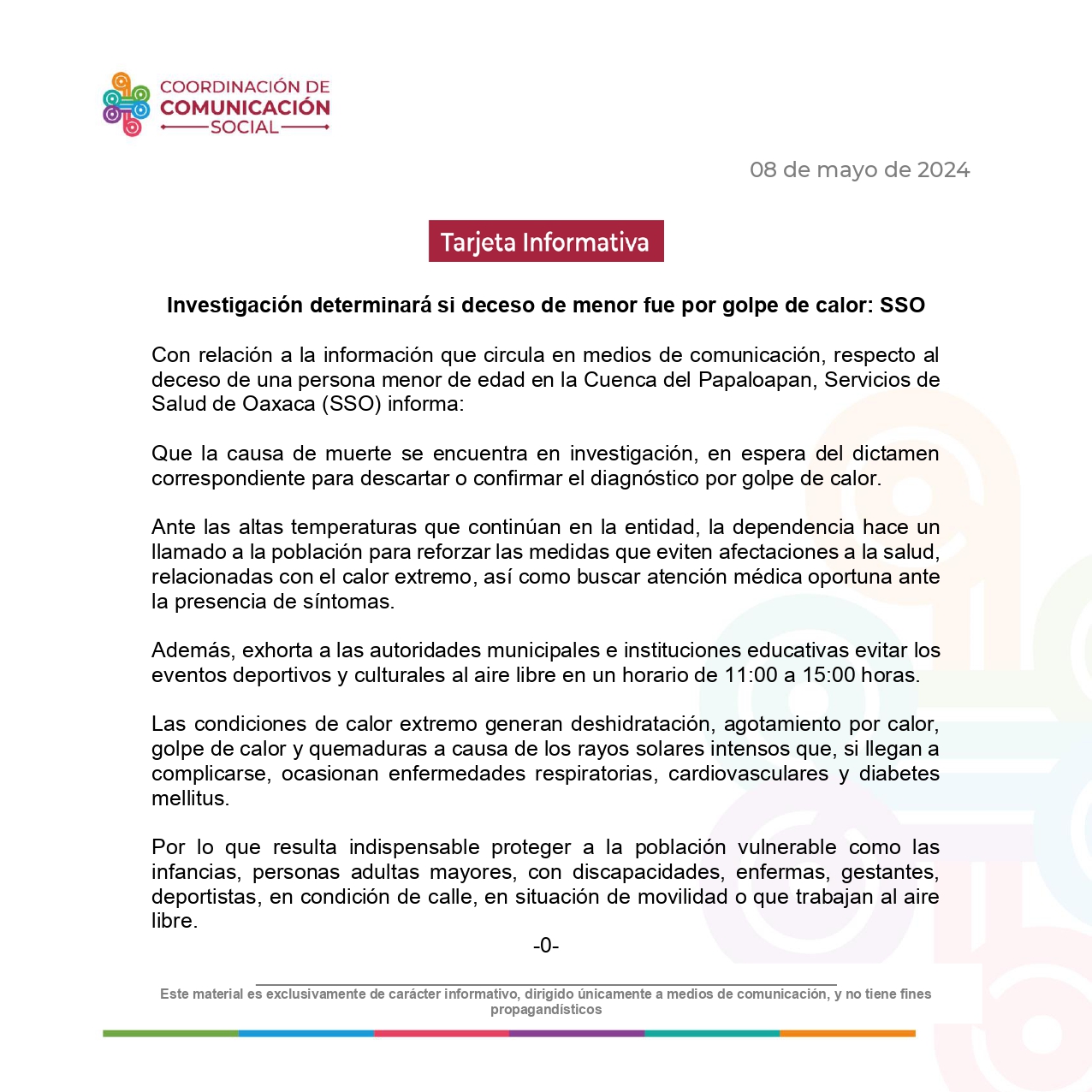 Con relación a la información que circula en medios de comunicación, respecto al deceso de una persona menor de edad en la Cuenca del Papaloapan, Servicios de Salud de Oaxaca (SSO) informa: