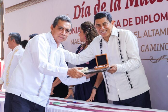 En el marco del Día de la Maestra y el Maestro, el Gobernador Salomón Jara Cruz asistió a la ceremonia para galardonar el compromiso, la entrega y dedicación que realizan en la formación educativa de niñas, niños, adolescentes y jóvenes de la entidad.