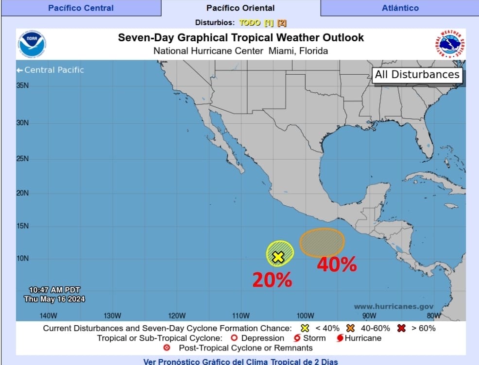 La Coordinación Estatal de Protección Civil y Gestión de Riesgos (CEPCyGR) informa que se han establecido dos centros de baja presión en el Pacifico Sur, el primero en el Golfo de Tehuantepec, con un 40 por ciento de probabilidad para desarrollo ciclónico a siete días; y el segundo muy lejos de la costa de Guerrero, con 20 por ciento de probabilidad de evolucionar.
