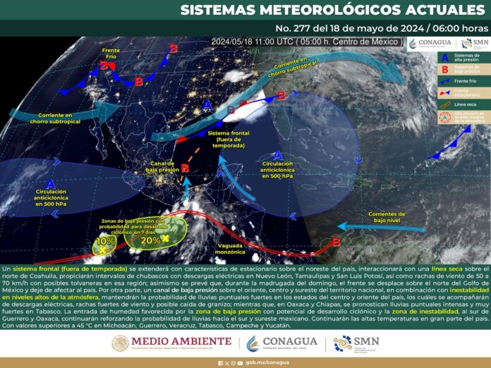 Lo anterior, de acuerdo con el pronóstico del tiempo emitido por la Comisión Nacional del Agua (Conagua), que señala que esto es ocasionado por los canales de baja presión sobre el oriente, centro y sureste de México, en combinación con una zona de inestabilidad ubicada al sur de las costas de Guerrero y Oaxaca.