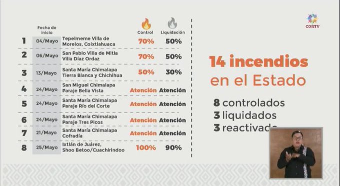 Destacó que se mantiene el incendio de Tepelmeme así como Villa de Mitla y Díaz Ordaz, son 8 controlados, 3 liquidados y 3 reactivados.