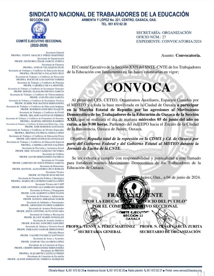 Para esta mañana de miércoles, a partir de las 09:00 horas, la sección 22 del magisterio oaxaqueño (@Seccion22Cencos ) marchará en la capital del estado en repudio “a las agresiones contra el Movimiento Democrático de los Trabajadores de la Educación”.