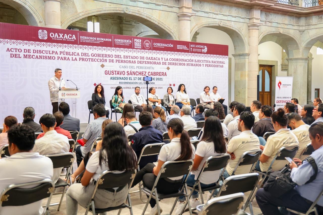 Por su parte, al ofrecer la disculpa pública a nombre del Gobierno del Estado de Oaxaca, el consejero Jurídico, Geovany Vásquez Sagrero, dijo que este acto es una forma en la que se asume el compromiso de garantizar que las y los periodistas ejerzan su actividad en condiciones de seguridad, y que las fallas que permitieron este hecho serán corregidas para que no vuelvan a repetirse.
