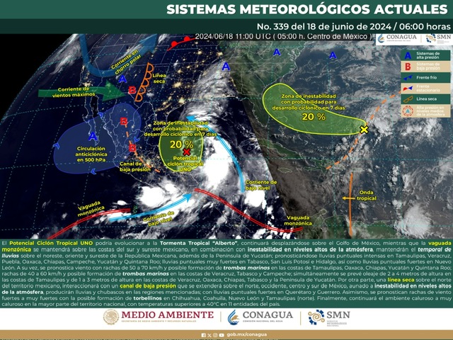 De acuerdo con el pronóstico del tiempo emitido por la Comisión Nacional del Agua (Conagua) la baja presión (evento que puede generar lluvias y fuertes vientos) se ubica al suroeste del Golfo de México, se ha reclasificado a Potencial Ciclón Tropical número uno, desplazándose lentamente sobre las inmediaciones del mismo Golfo.