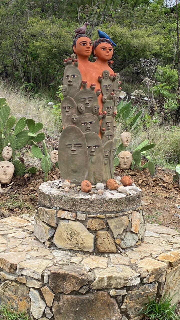 En el Centro de Educación y Conservación Ecológica La Mesita, ubicado en la parte alta de esta localidad del Valle Eteco, a unos 10 kilómetros de la capital oaxaqueña, Maricela, originaria de Santo Domingo Yanhuitlán, explicó que dicha pieza moldeada con material y los colores de la tierra y verde del nopal, representativo de la nación mexicana, brinda un homenaje a la generación familiar de ella y su compañero, el también escultor y pintor, Manuel Reyes, quien tiene instalado en este espacio su obra “La Madre Naturaleza”.