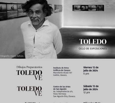 La muestra en el Instituto de Artes Gráficas de Oaxaca (IAGO) va ligada con la del Centro de las Artes de San Agustín (CaSa), en el primer sitio se presentarán algunos de los bocetos de las obras que integran la exposición “Toledo Ve” que podrá verse en el CaSa. Estas piezas no se han mostrado antes y son parte del acervo de la asociación civil Amigos del IAGO y del CFMAB.
