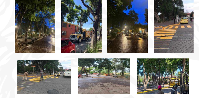 Estas acciones forman parte de las obras para el rescate y mantenimiento espacios públicos, se informa en un comunicado de prensa. Así mismo en la calle de Reforma desde Independencia hasta Margarita Maza de Juárez, con el fin de sanear los árboles, se realizaron los derribos pertinentes y