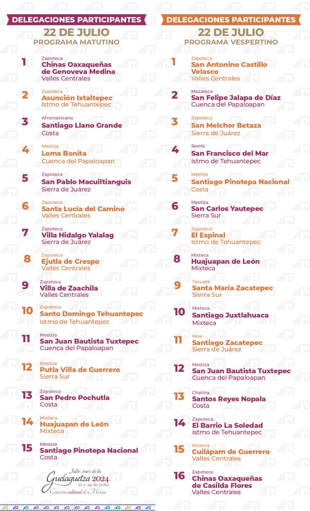 Para la emisión vespertina que iniciará a las 17:00 horas, danzarán y mostrarán su cultura en la Rotonda de las Azucenas 16 delegaciones conformadas por San Melchor Betaza, San Francisco del Mar, Santiago Pinotepa Nacional, San Felipe Jalapa de Díaz, San Antonino Castillo Velasco, El Espinal, Huajuapan de León y San Carlos Yautepec.