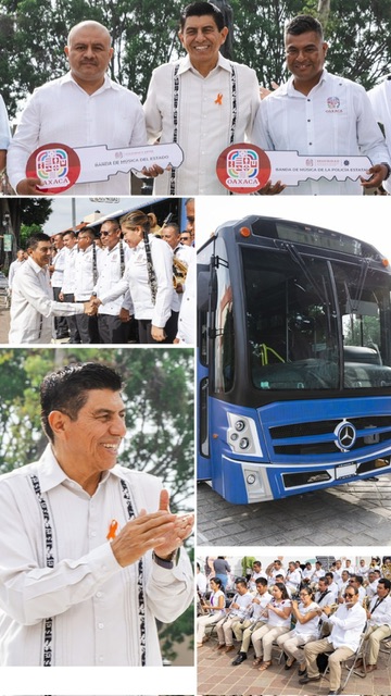 Así, frente a la estatua del ilustre oaxaqueño Benito Juárez García, el titular del Poder Ejecutivo otorgó de forma simbólica las llaves de estos transportes al director de la Banda de Música del Estado, Alejandro Guantes Teodosio y al director de la Banda de Música de la Policía Estatal, Adolfo León Aquino.