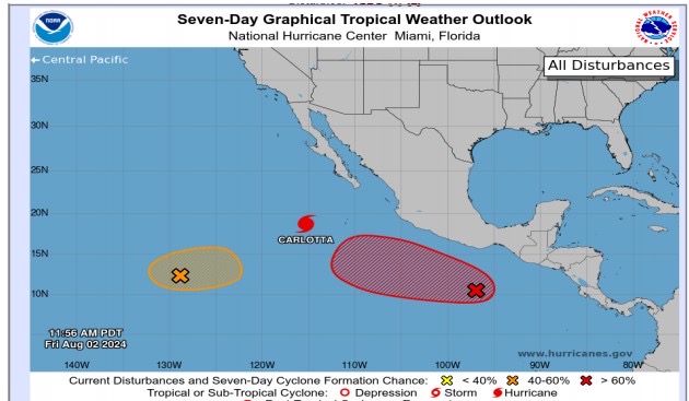 La Coordinación Estatal de Protección Civil y Gestión de Riesgos (CEPCyGR) informa a la población que de acuerdo con el Centro Nacional de Huracanes (NHC por sus siglas en inglés), se mantiene en vigilancia una amplia zona de baja presión localizada al sur de las costas de Oaxaca y Chiapas con probabilidad para desarrollo ciclónico de 50 por ciento a 48 horas y de 90 por ciento a 7 días.