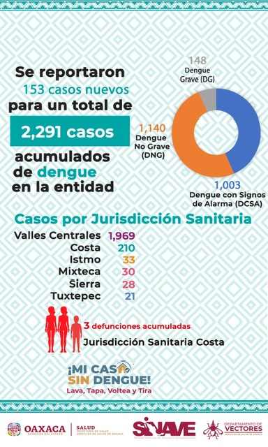 Oaxaca de Juárez, Oax. 7 de agosto de 2024.-Servicios de Salud de Oaxaca (SSO) informa que durante la semana epidemiológica número 31 se reportaron 44 municipios con nuevos casos de dengue, principalmente en Oaxaca de Juárez, demarcación que notificó 37 casos, seguido de Santa Cruz Xoxocotlán con 14 casos e igual número en Pinotepa Nacional.