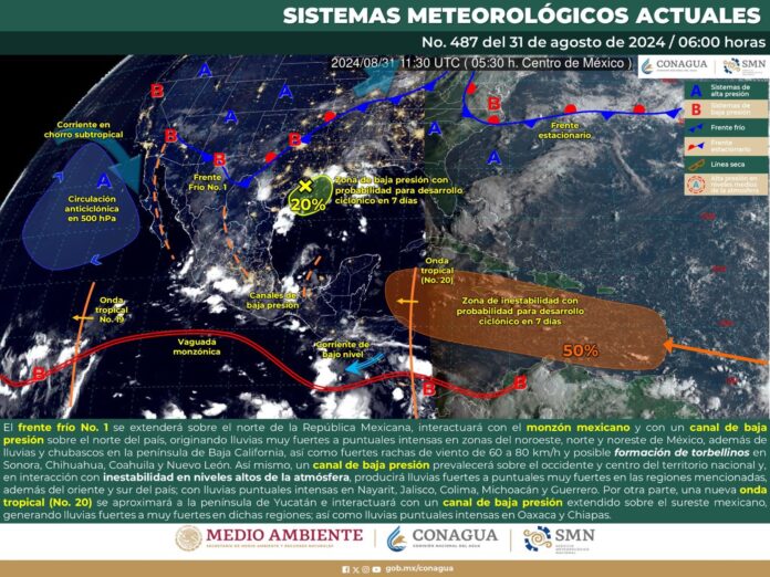 De acuerdo con el pronóstico del tiempo emitido por la Comisión Nacional del Agua (Conagua), se prevé que continúe una situación inestable debido a canales de baja presión, entrada de humedad del Océano Pacífico y la aproximación de esta nueva onda tropical, además de un frente frío que se extenderá sobre el norte de la República Mexicana, sin efecto para Oaxaca.