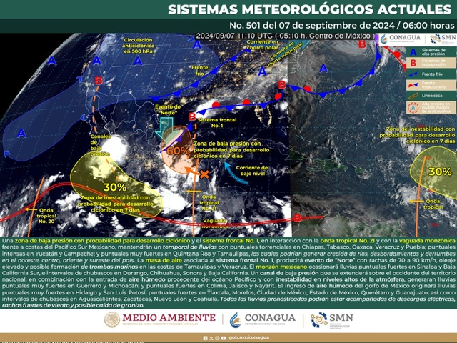 También, la masa de aire frío que impulsa al sistema frontal ocasionará a partir de este sábado evento de norte moderado a fuerte que se propagará hacia el Golfo de Tehuantepec, donde se desarrollará oleaje anormal y mar picado.