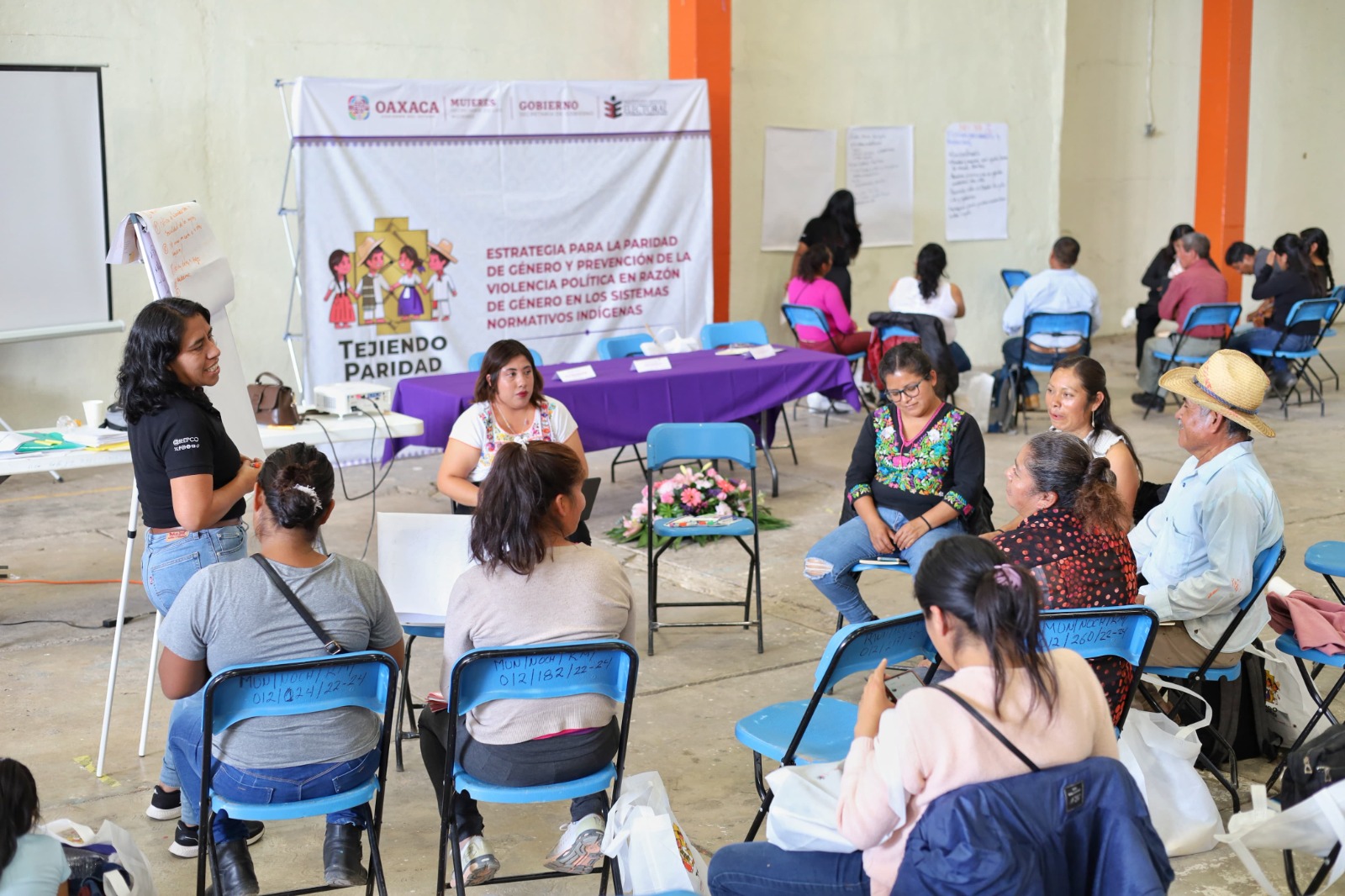 Para promover la participación política de las mujeres en los municipios que se rigen por Sistemas Normativos Indígenas (SNI), la Secretaría de las Mujeres (SM) en coordinación con la Secretaría de Gobierno (Sego) y el Instituto Estatal Electoral y de Participación Ciudadana de Oaxaca (IEEPCO), inició la Estrategia “Tejiendo paridad”.