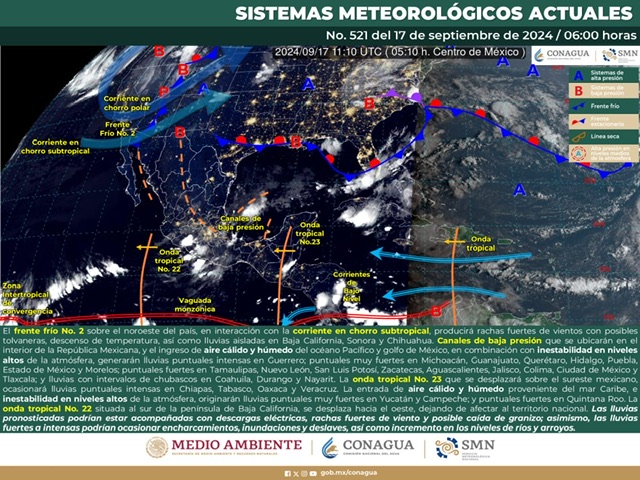El frente frío número 2 se extiende sobre el noroeste de México y dos ondas tropicales muy activas se observan sobre el Atlántico y el Caribe; ninguno de estos fenómenos representa peligro para la entidad, sin embargo, se mantienen en vigilancia.