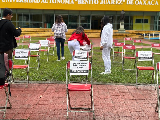Los integrantes de la UJRM colocan, frente a rectoría de la UABJO, 43 sillas con los nombres de los 43 estudiantes normalistas desaparecidos de Ayotzinapa.