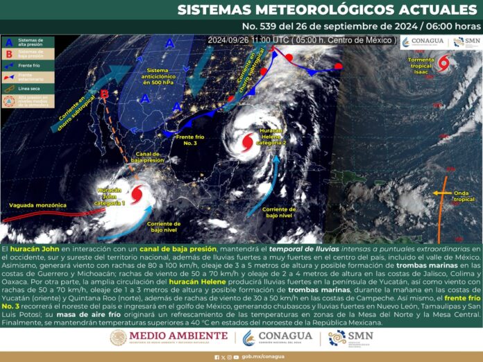 De acuerdo con el pronóstico del tiempo emitido por la Comisión Nacional del Agua (Conagua), el huracán “John” continúa interactuando con la vaguada monzónica (un cinturón de inestabilidad atmosférica) extendida a lo largo del pacifico mexicano y con un canal de baja presión lo que permite estas condiciones atmosféricas.