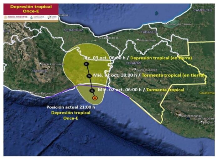 La depresión tropical Once-E del Océano Pacífico, se localizó a las 21:15 horas de este martes a 80 kilómetros al suroeste de Barra de Tonalá, Chiapas y a 95 kilómetros al sureste de Salina Cruz, Oaxaca, se desplaza al norte a nueve kilómetros por hora con vientos máximos sostenidos de 55 kilómetros por hora y rachas de 75 kilómetros por hora.