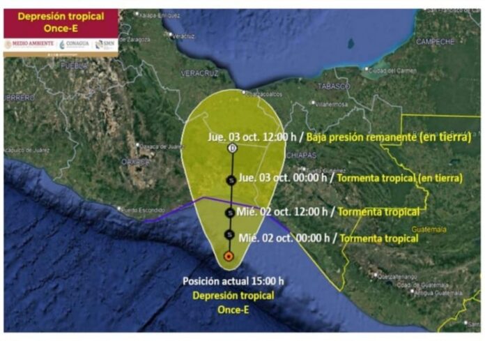La depresión tropical Once-E ubicada en el Océano Pacífico, se localizó a las 15:15 horas a 120 kilómetros al sur-suroeste de Barra de Tonalá, Chiapas y a 140 kilómetros al sur-sureste de Salina Cruz, se desplaza al norte a siete kilómetros por hora con vientos máximos sostenidos de 75 kilómetros por hora y rachas de 85 kilómetros por hora.