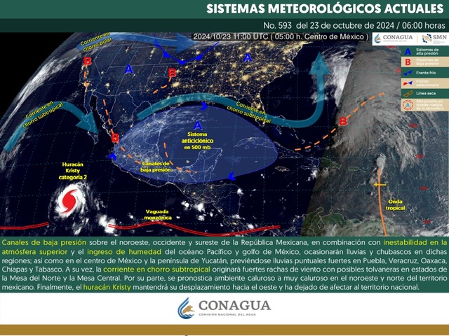 Oaxaca de Juárez, Oax. 23 de octubre de 2024.- La Coordinación Estatal de Protección Civil y Gestión de Riesgos (CEPCyGR) informa que canales de baja presión y ligera entrada de humedad del Océano Pacífico, así como el calentamiento diurno, favorecerán la presencia de lluvias ligeras con chubascos dispersos en zonas montañosas del estado.