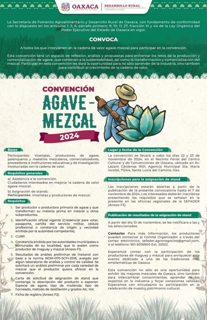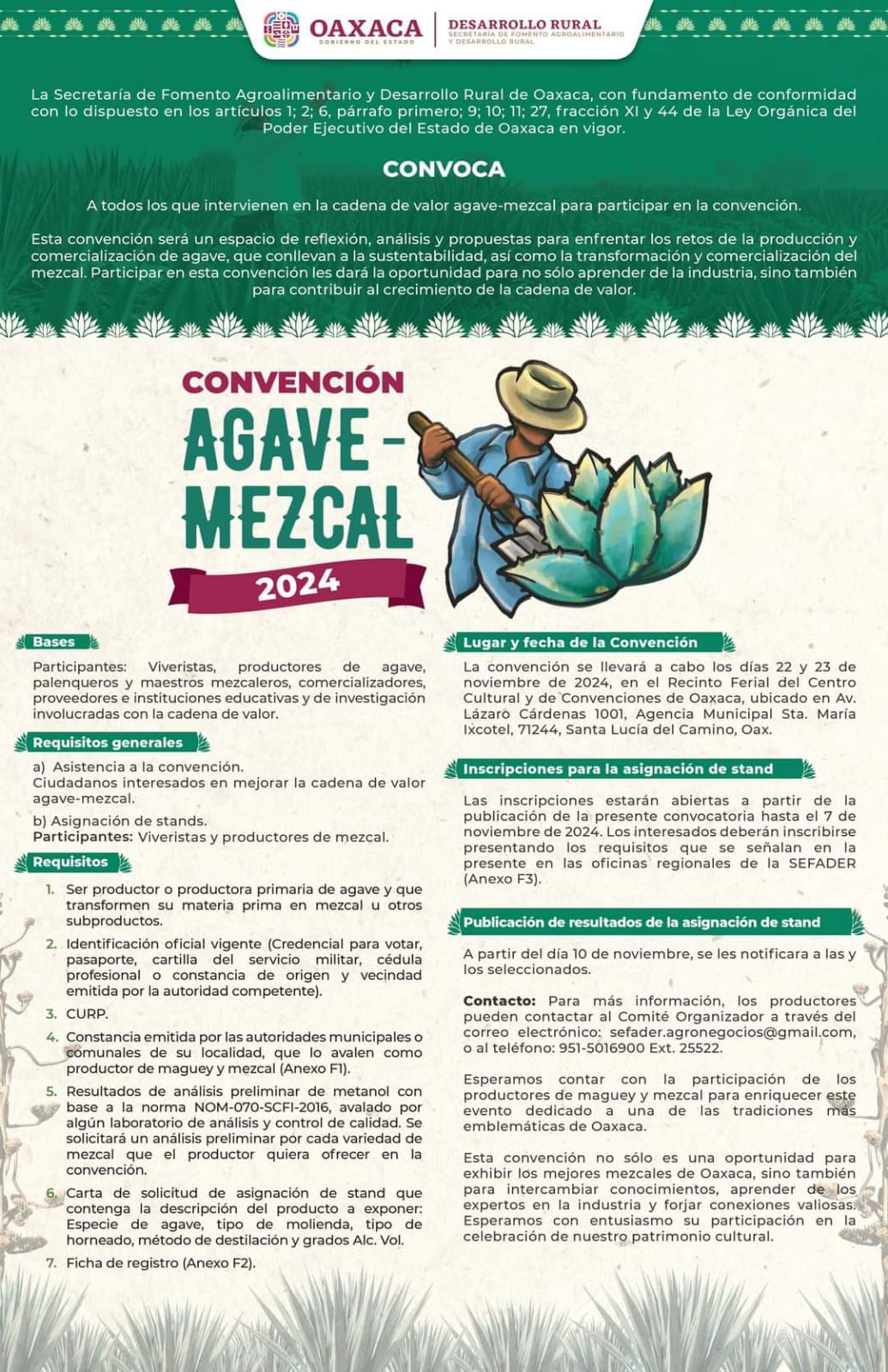 Por ello, el Gobierno de Oaxaca a través de la Secretaría de Fomento Agroalimentario y Desarrollo Rural (Sefader), emitió una convocatoria para participar en la Convención Agave Mezcal 2024, dirigida a todas las personas que intervienen en la cadena de valor agave-mezcal.
