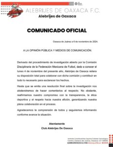 Dos días después de lo publicado por la FMF, el club Alebrijes también informa que se abstendrá de todo tipo de comentarios hasta que se emita una resolución final.